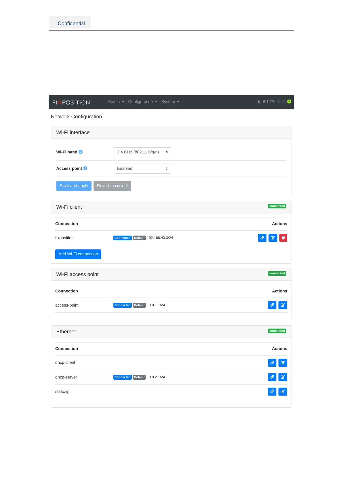 page presents the configuration for the Wi-Fi interface, client, and access point, as well