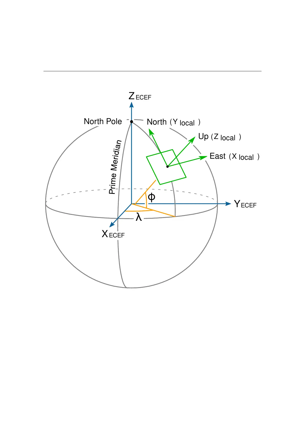 Figure C.1.: ECEF (global) and ENU (local) coordinate systems
