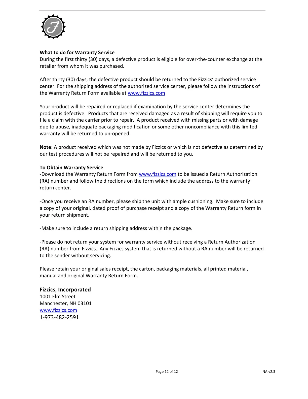 -Download the Warranty Return Form from www.fizzics.com to be issued a Return Authorization