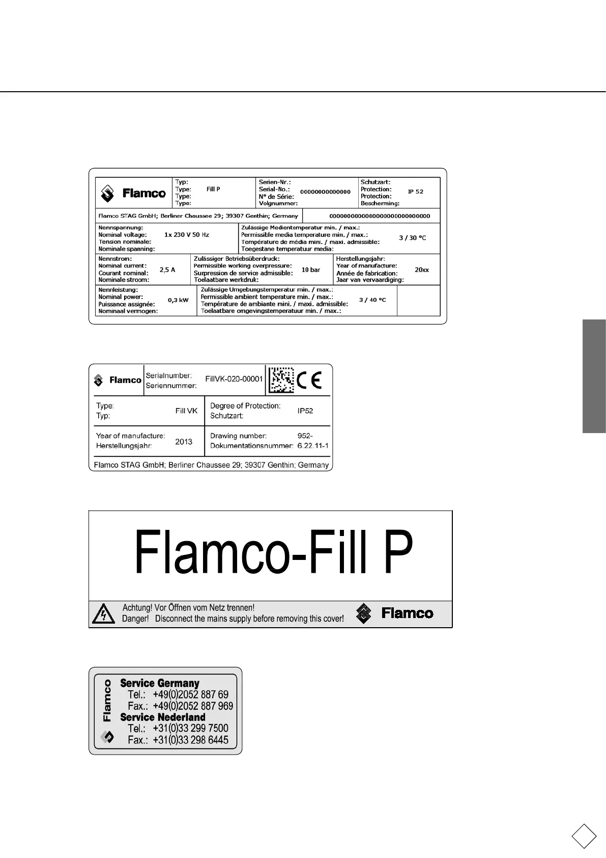Typeplaatje met opmerkingen over elektrische veiligheid op de klemmendeksel