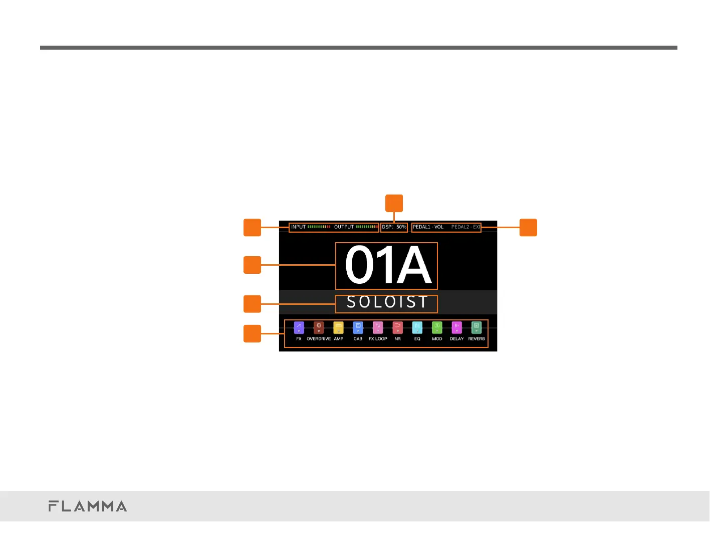 3.Expressionpedaldisplay.ShowscurrentfunctionofPEDAL1(internalpedal)and