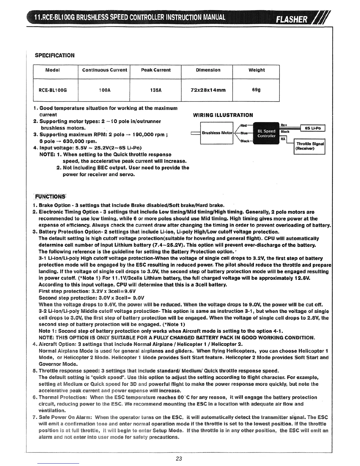 Flasher 600 ESP - RCE-BL100 G Brushless Speed Controller Manual; ESC Functions Overview