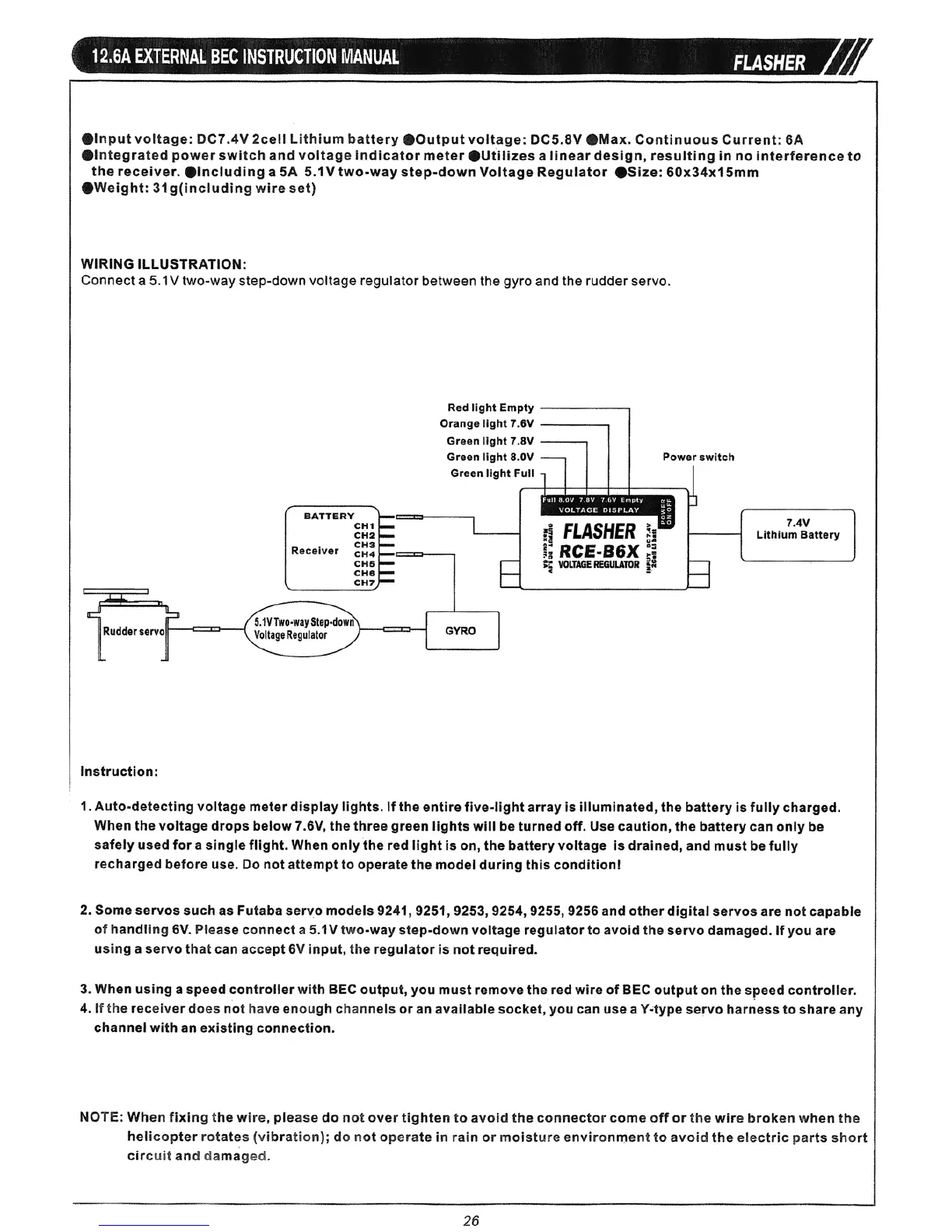 Flasher 600 ESP - 6 A External BEC Instruction Manual; BEC Specifications, Wiring, and Usage