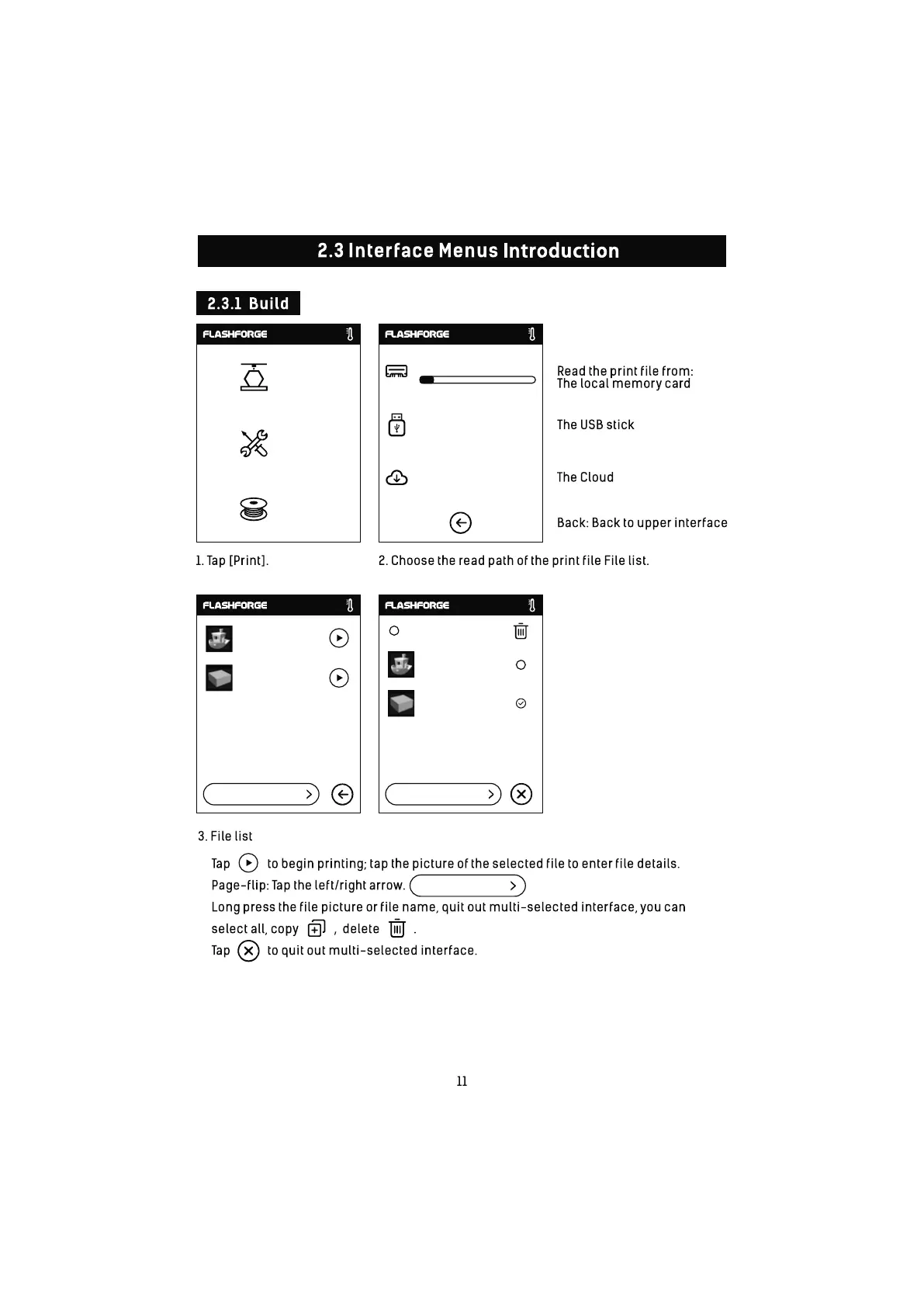 FLASHFORGE 3D PRINTER Adventurer 3 - 2.3 Interface Menus Introduction; 2.3.1 Build