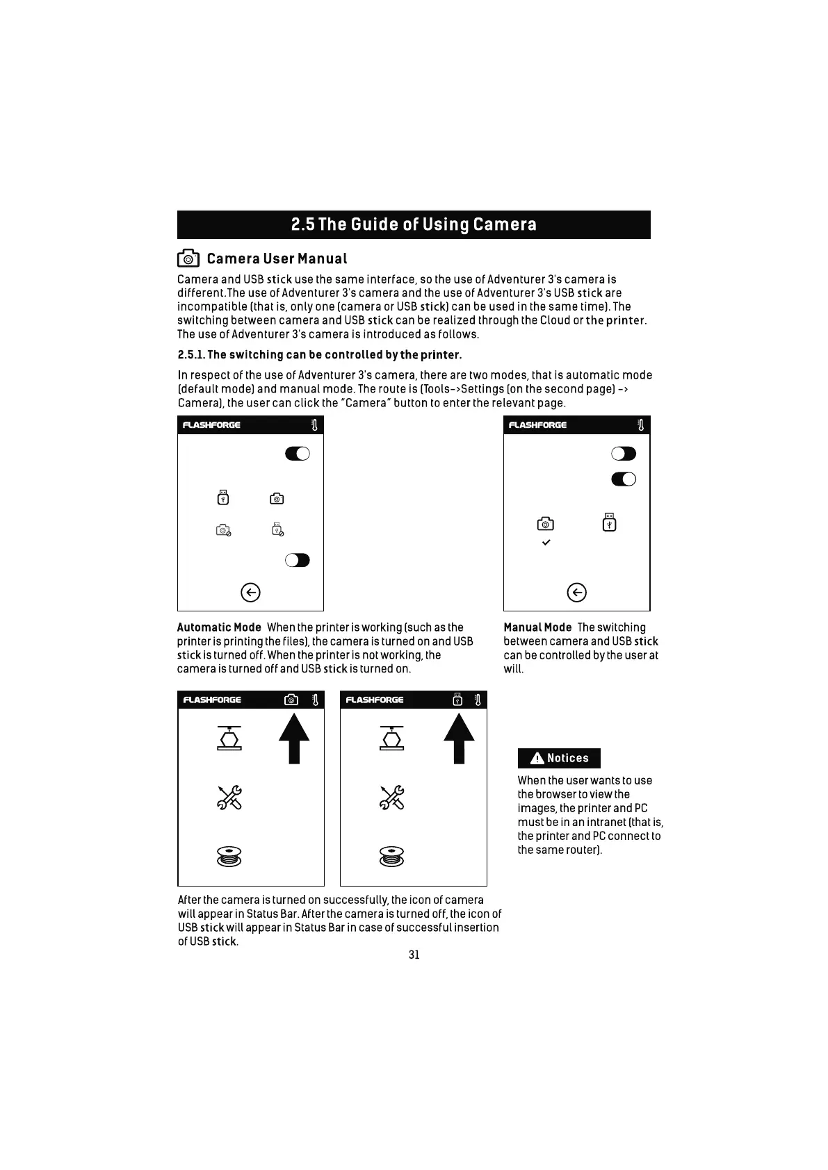 FLASHFORGE 3D PRINTER Adventurer 3 - 2.5 The Guide of Using Camera; 2.5.1. The switching can be controlled by the printer.