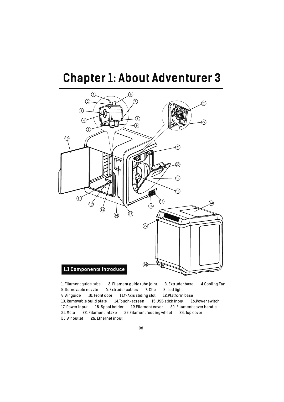 FLASHFORGE 3D PRINTER Adventurer 3 - Chapter 1: About Adventurer 3; 1.1 Components Introduce; 1.2 Reference