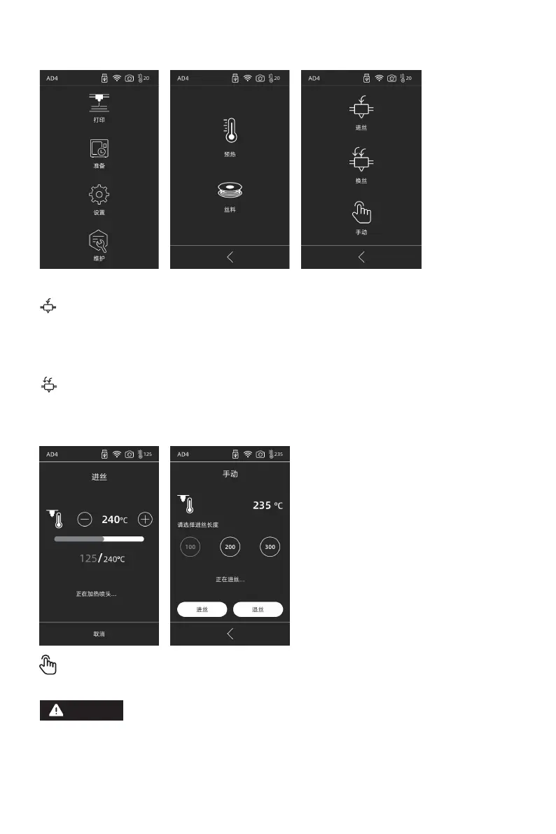 点击手动后,喷头将加热到所设置的温度;选择对应长度后,选择进/退丝。