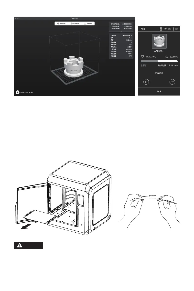 打印完成时,喷嘴和打印平台仍处于高温状态,建议冷却后操作。