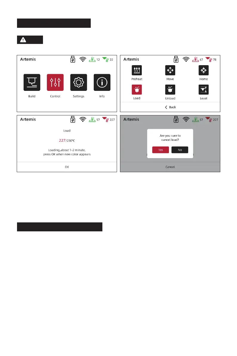 Tap [Control] - [Load]. It starts to load the filament when the targeted temperature