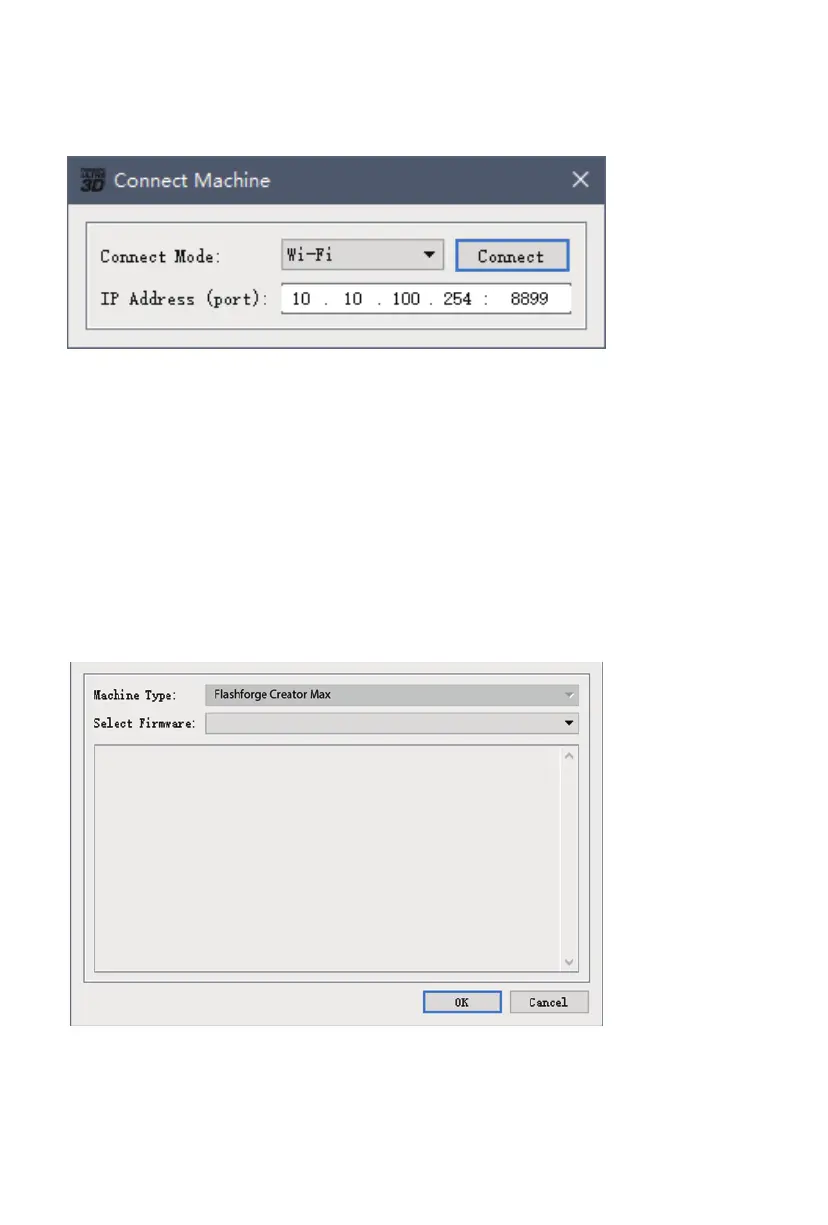 the IP Address, as shown on the Flashforge Creator Max's screen. Click Connect.