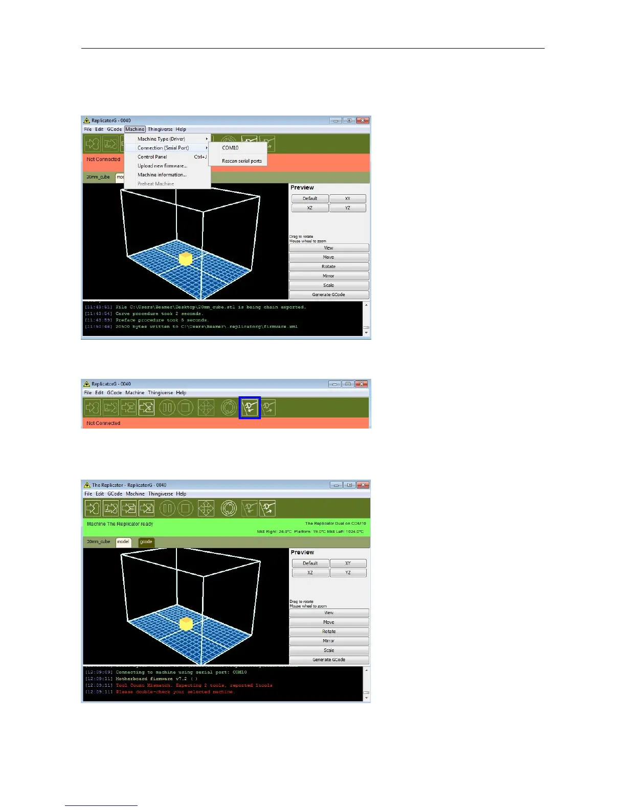 Now we can link the machine to the computer. Click on the printer connect icon highlighted in blue :