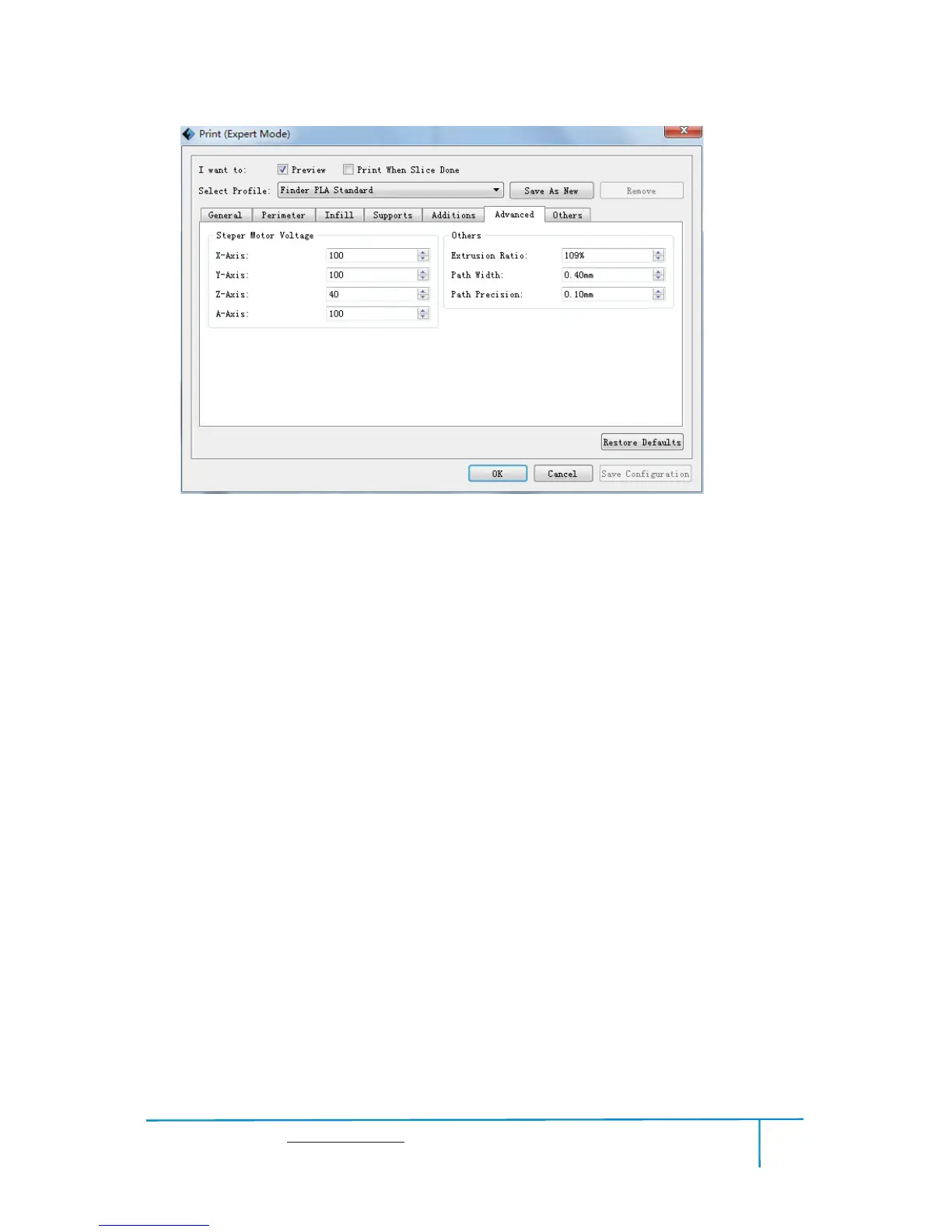 a.Extrusion Ratio: The filament amount extruded by the extruder. Default: 109%