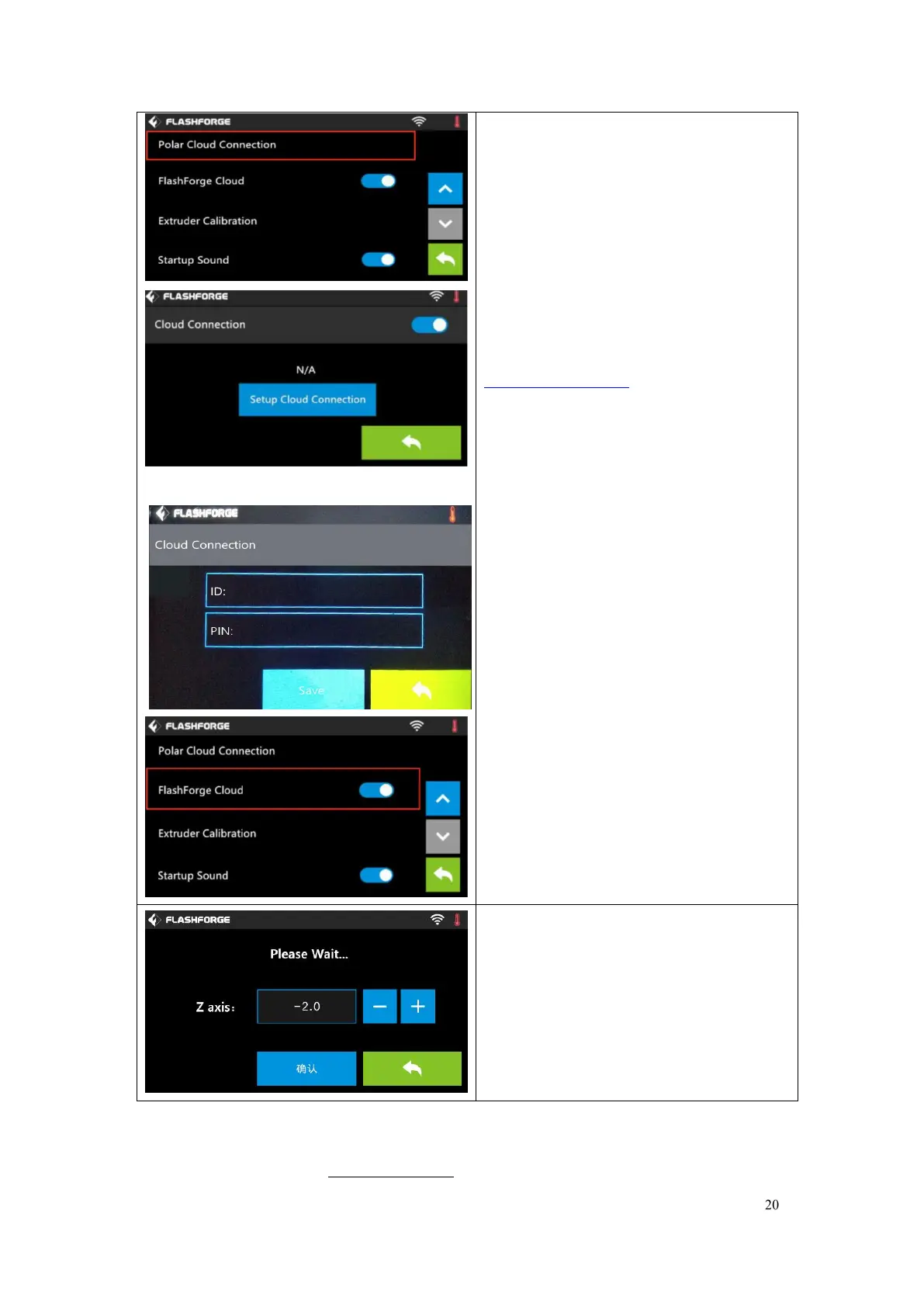 Tap to turn on/off the FlashForge Cloud