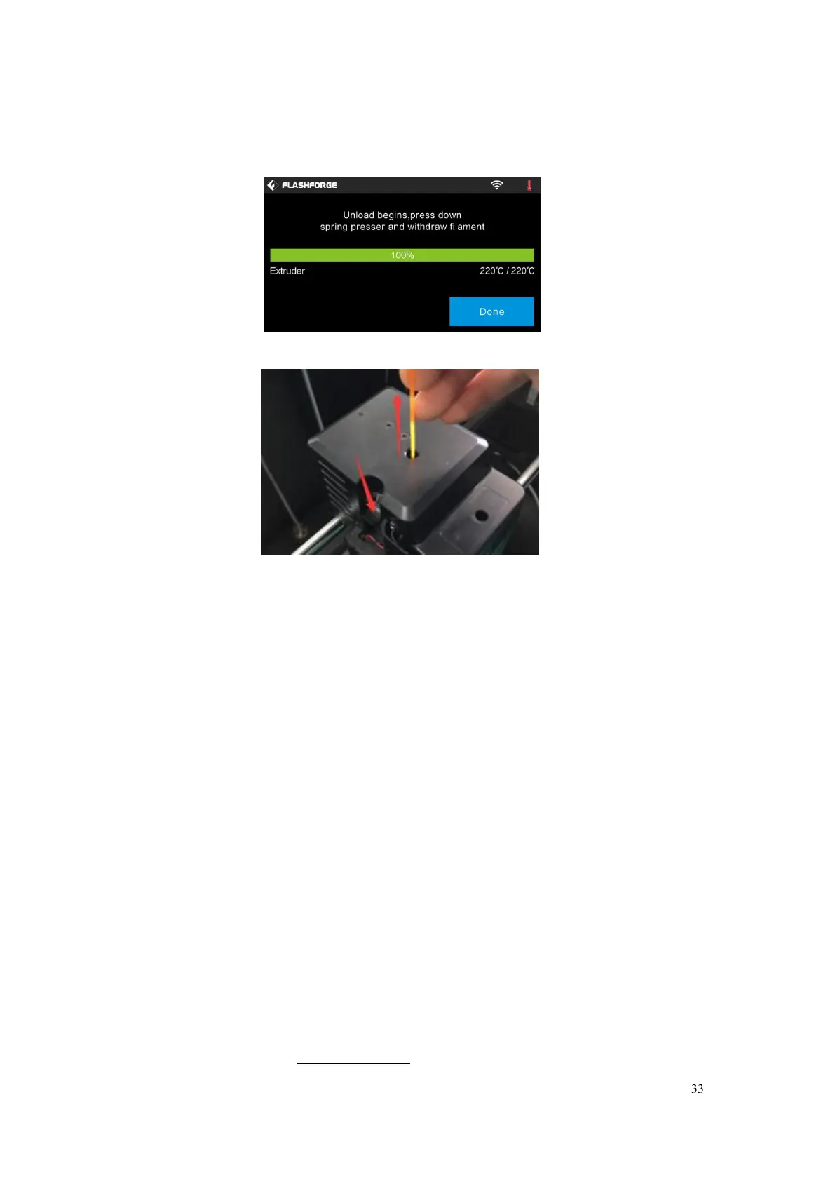 prompt you to unload the filament from the extruder. Press the spring presser,