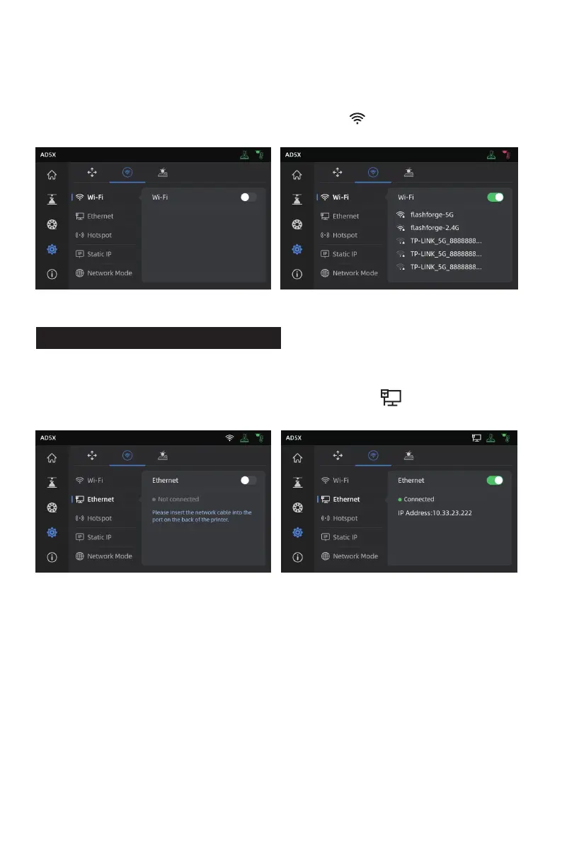 1. Select [Ethernet] and plug the network cable into the Ethernet port on the back of the printer