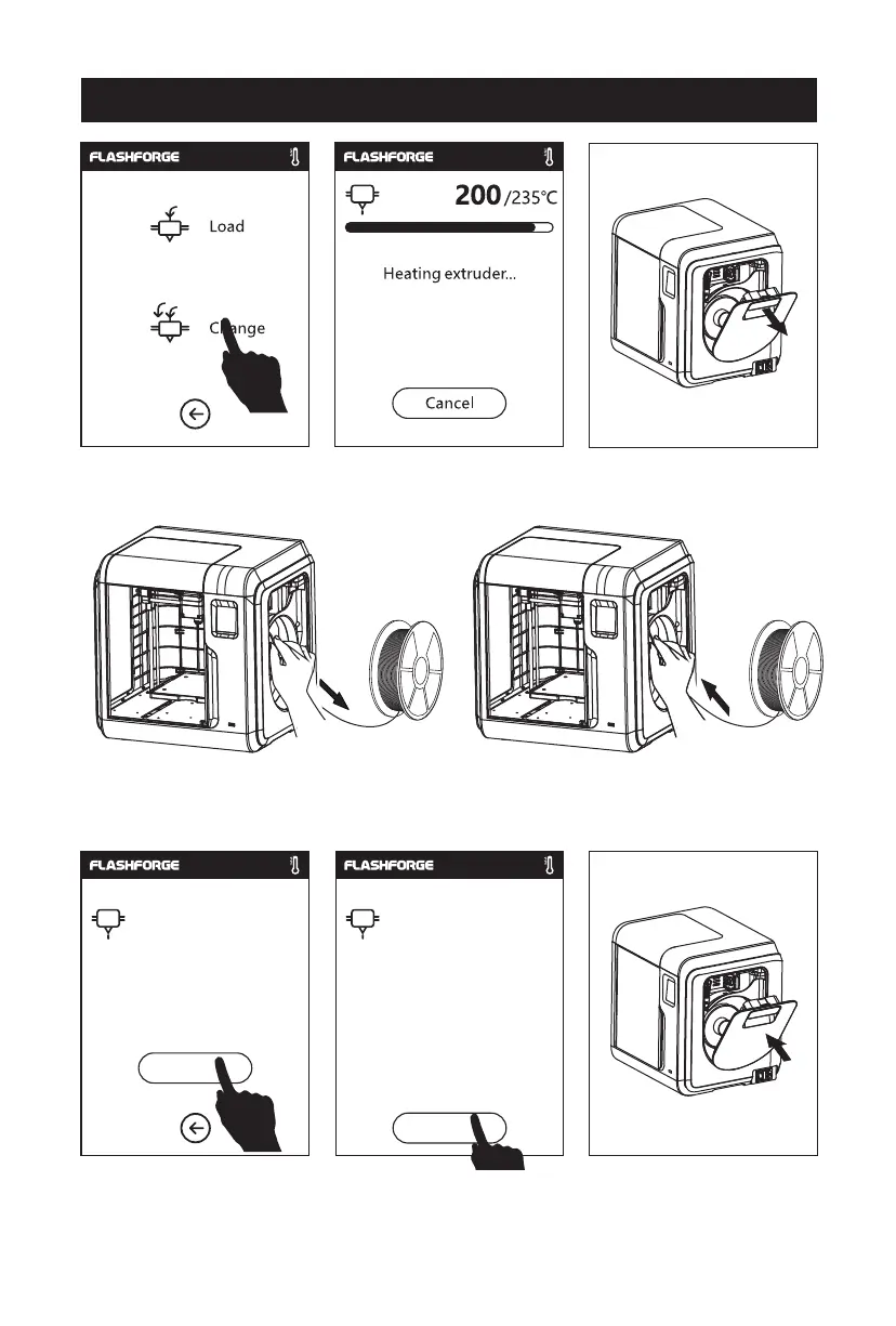 1. Tap [Filament], tap [Change], extruder starts