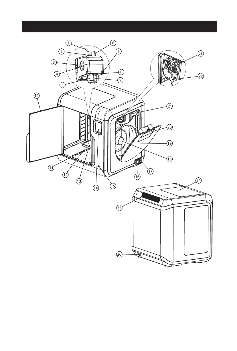 17. Power input 18. Spool holder 19.Filament cover 20. Filament cover handle