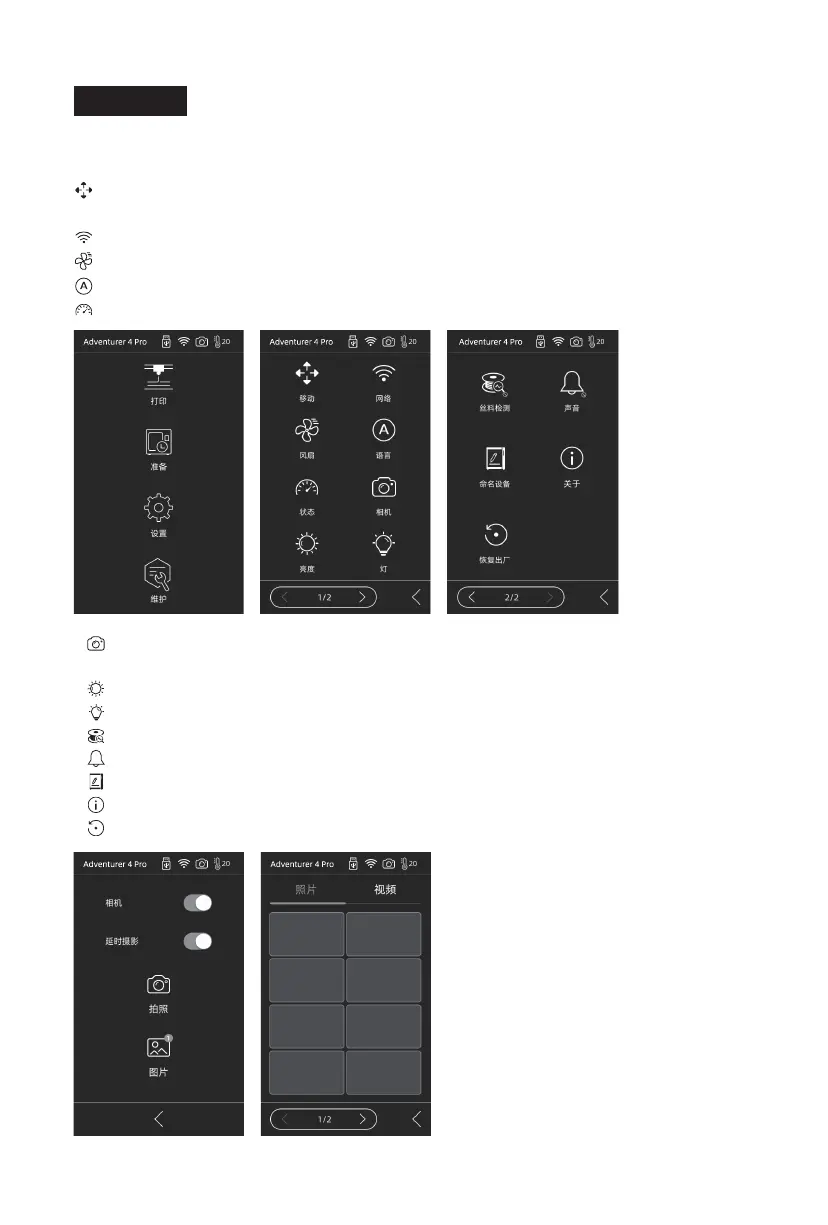 设置包含移动、网络、风扇、语言、状态、相机、亮度、灯、丝料检测、声音、命名设备、关于、