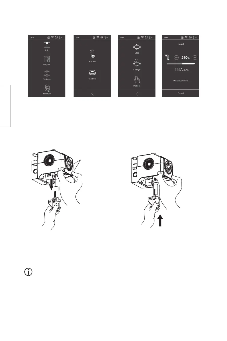 1. Tryck Prepare 2. Tryck Filament 3. Tryck Change 4. Skrivarhuvudet