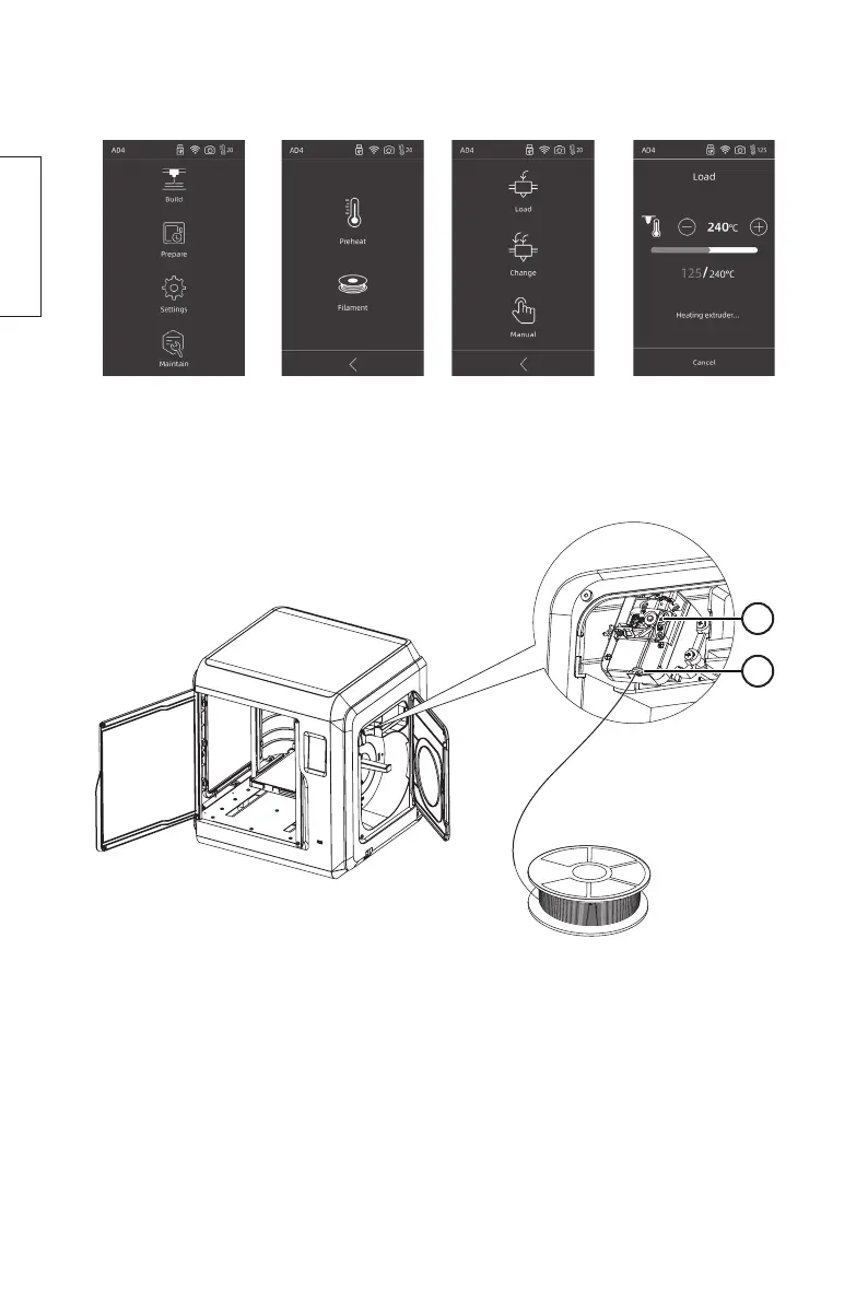 1. Press Prepare 2. Press Filament 3. Press Load 4. The extruder