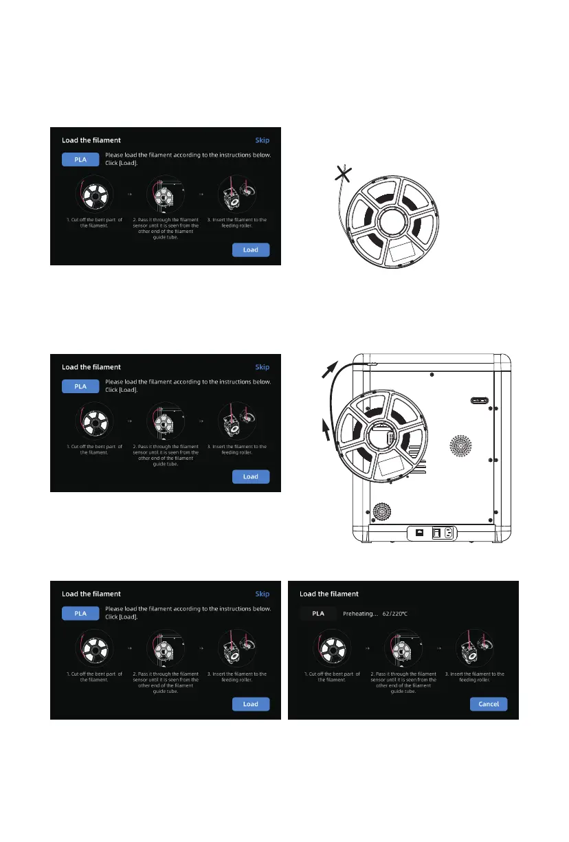 C1. Click [Load] and select [PLA] for the first print. C2. Wait for the extruder to heat up.