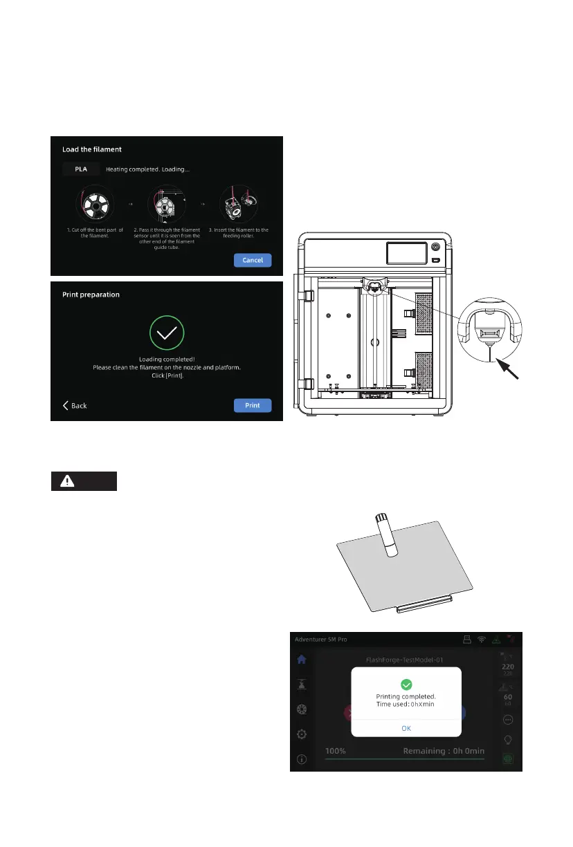 C3. Feeding will begin after heating. Successful filament extrusion from the nozzle indicates