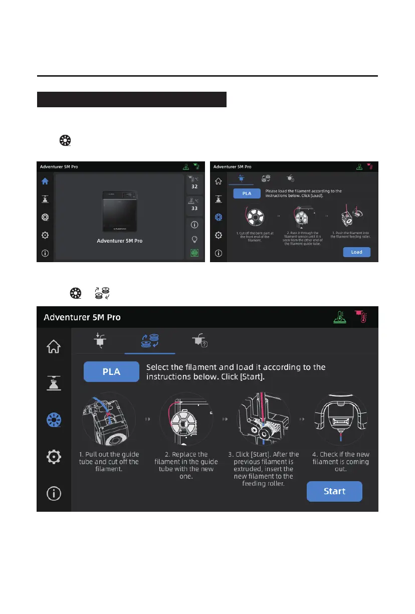 1. Click [ ] - [ ], and follow on-screen instructions to complete filament changing.