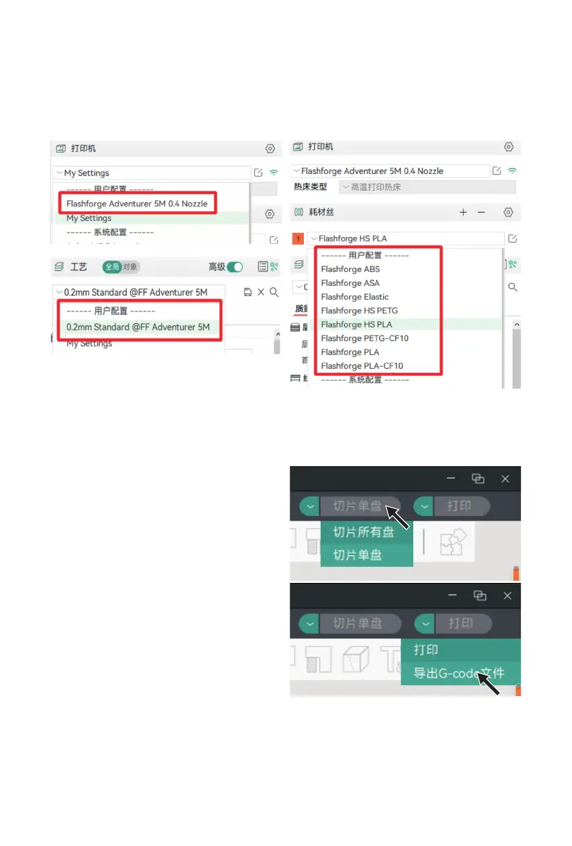 4. 导入完成后,在打印机、耗材丝、工艺栏的用户配置里分别会显示对应机型、可选材料及推荐参数。