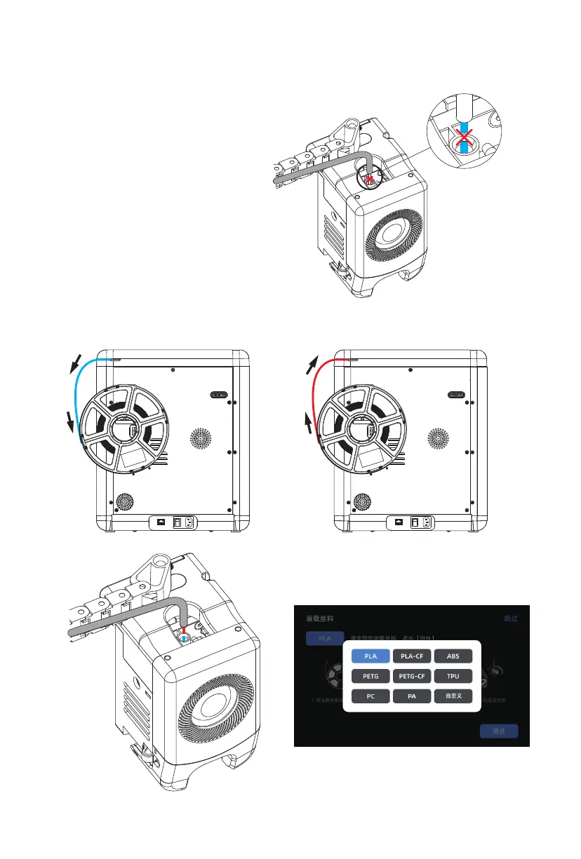 3. 抽出已剪断的丝料,将新的丝料插入导丝管。如材料类型更换,点击[PLA]按钮选择相应的耗材类型。