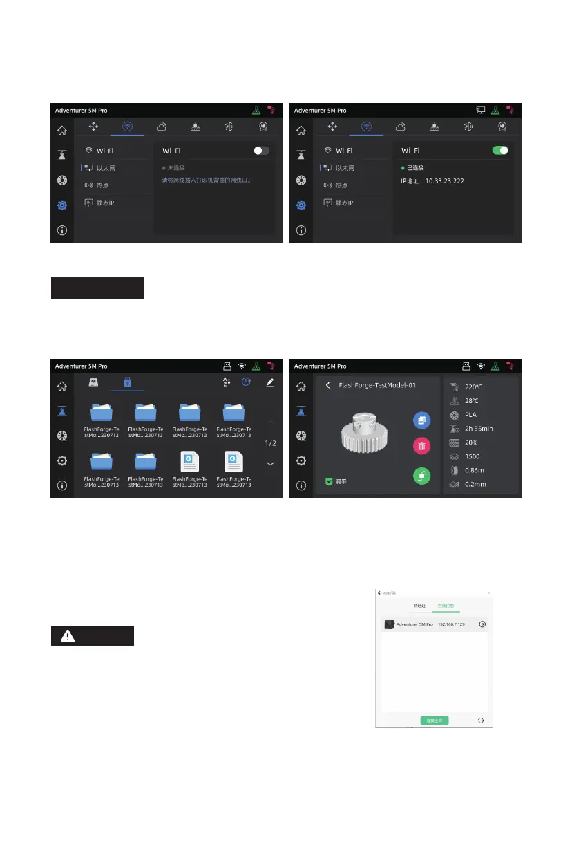 打印机连接网络成功后,打开FlashPrint 5,切片完成后,点击菜单中的打印按钮,选择冒险家5M Pro