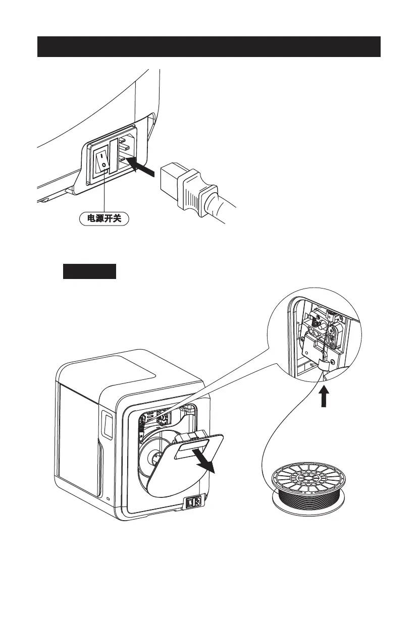 1. 打开料盘盖,将丝料插入进丝口,推入