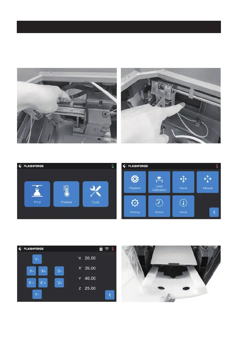6. Press and hold [Z-] continuously until the build plate rises to a higher position, and