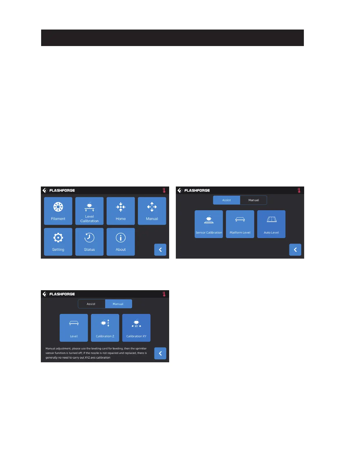 Manual leveling mode: Execute platform leveling, Z-axis calibration and X, Y axis calibration in turn. This is a complete