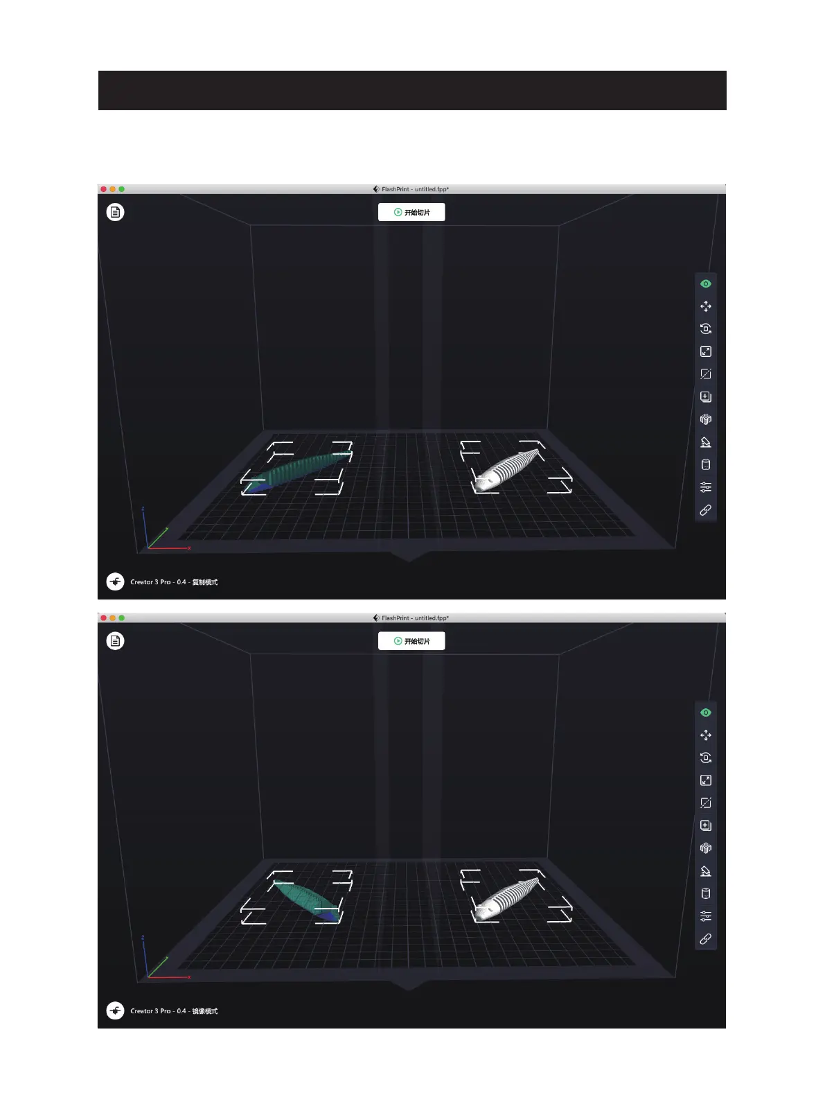 当需要打印两个相同或者镜像的模型,可以选择镜像/复制模式,在此类模式下,左右喷头将同时打印模型。(注意镜像/复