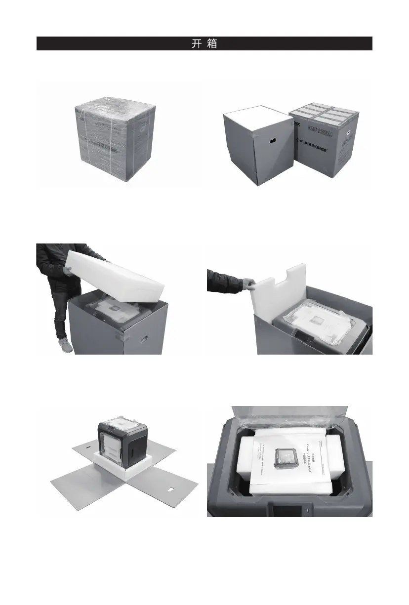 5. 割开纸箱四角的胶带露出打印机。打开