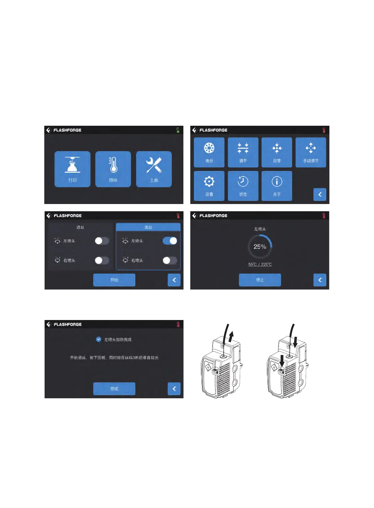 注意:若喷头长时间未出丝,请检查安装耗材时是否正确将耗材插入喷头底部。