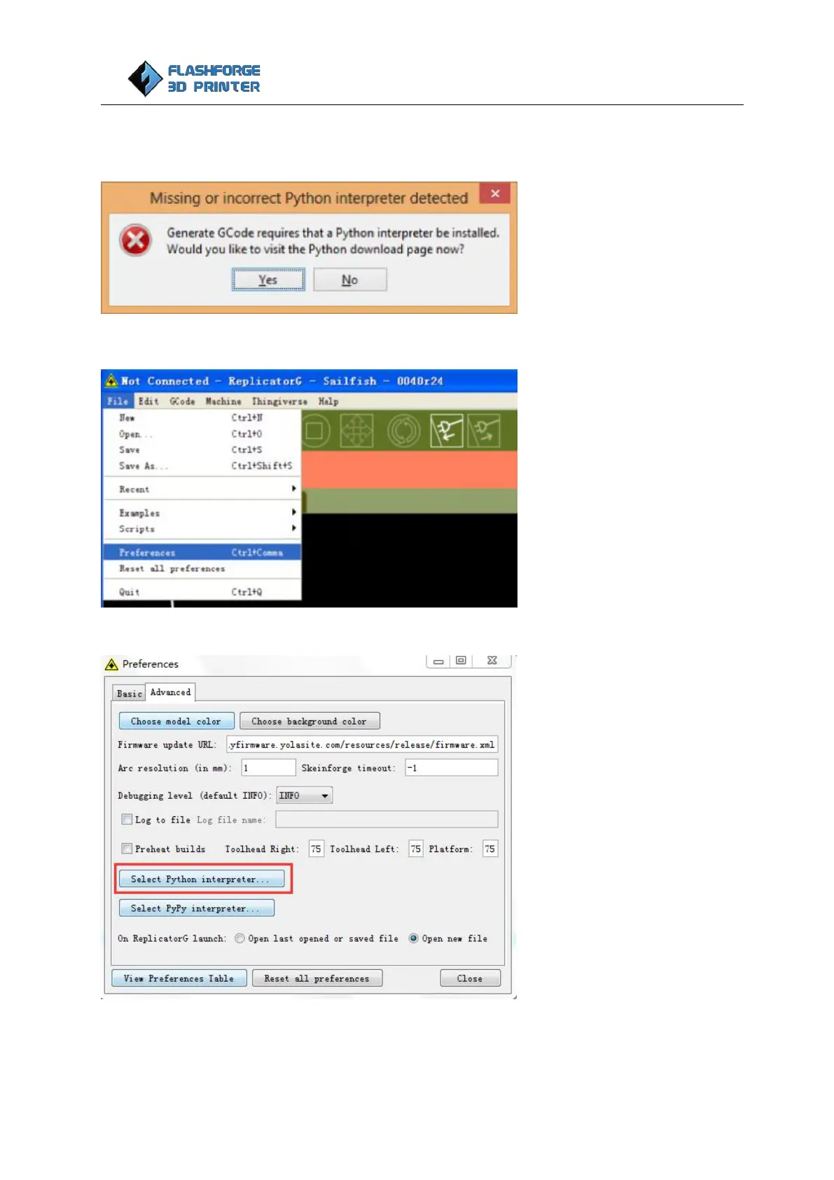 Click File > Preferences, then click ‘Select Python interpreter’ on the Advanced tab. A window will pop up,