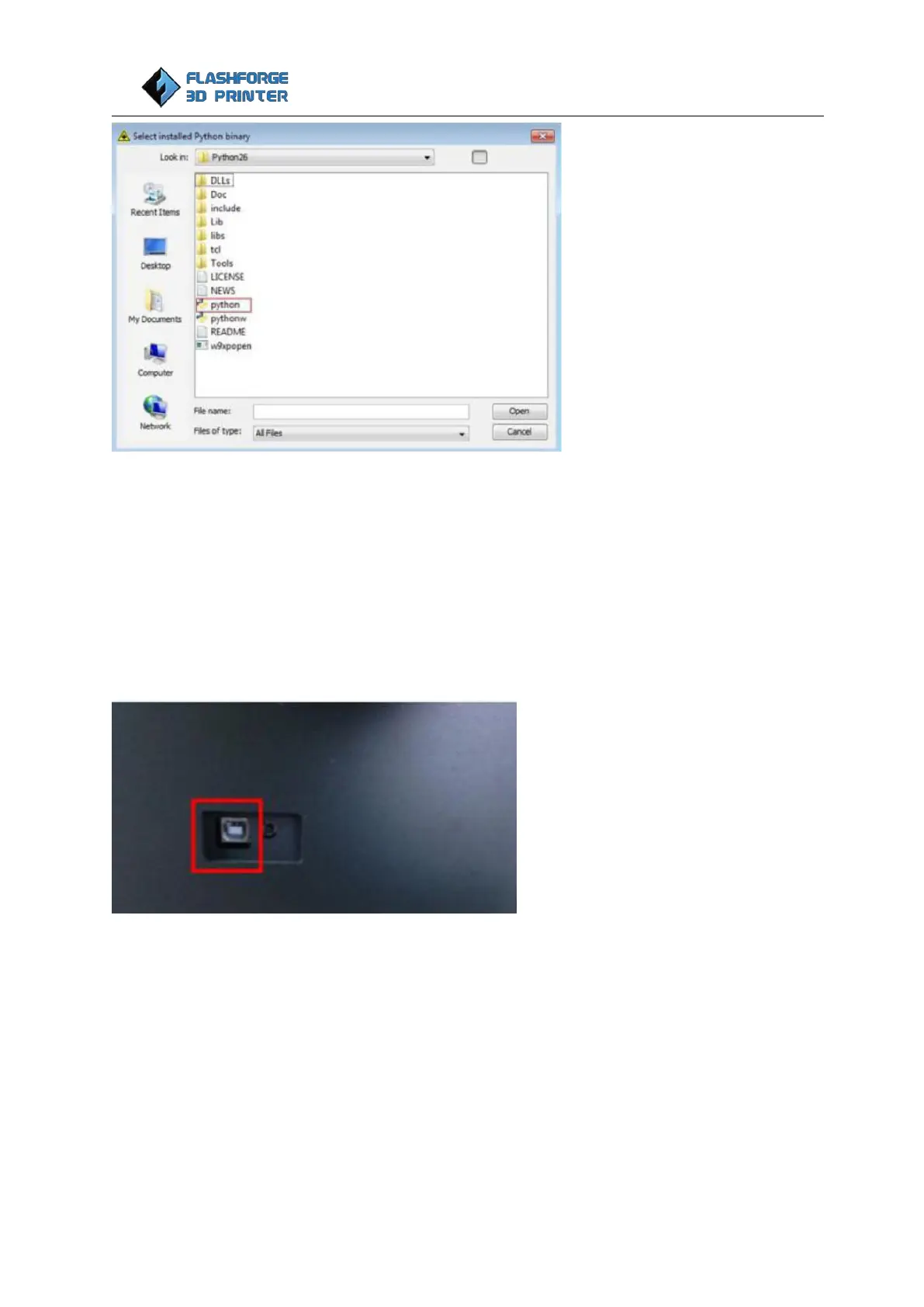 The USB port on the machine is bound by the red box in the above image. After connecting the cable, open