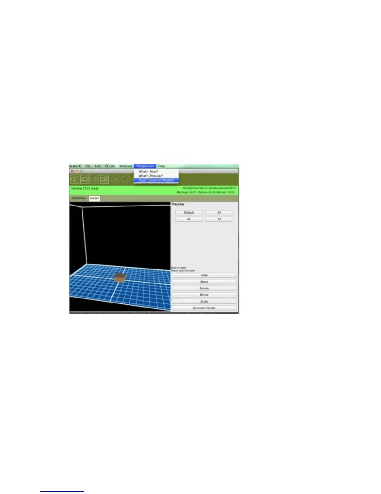 First, you'll need to find a dual extrusion model to print. Go into ReplicatorG's
