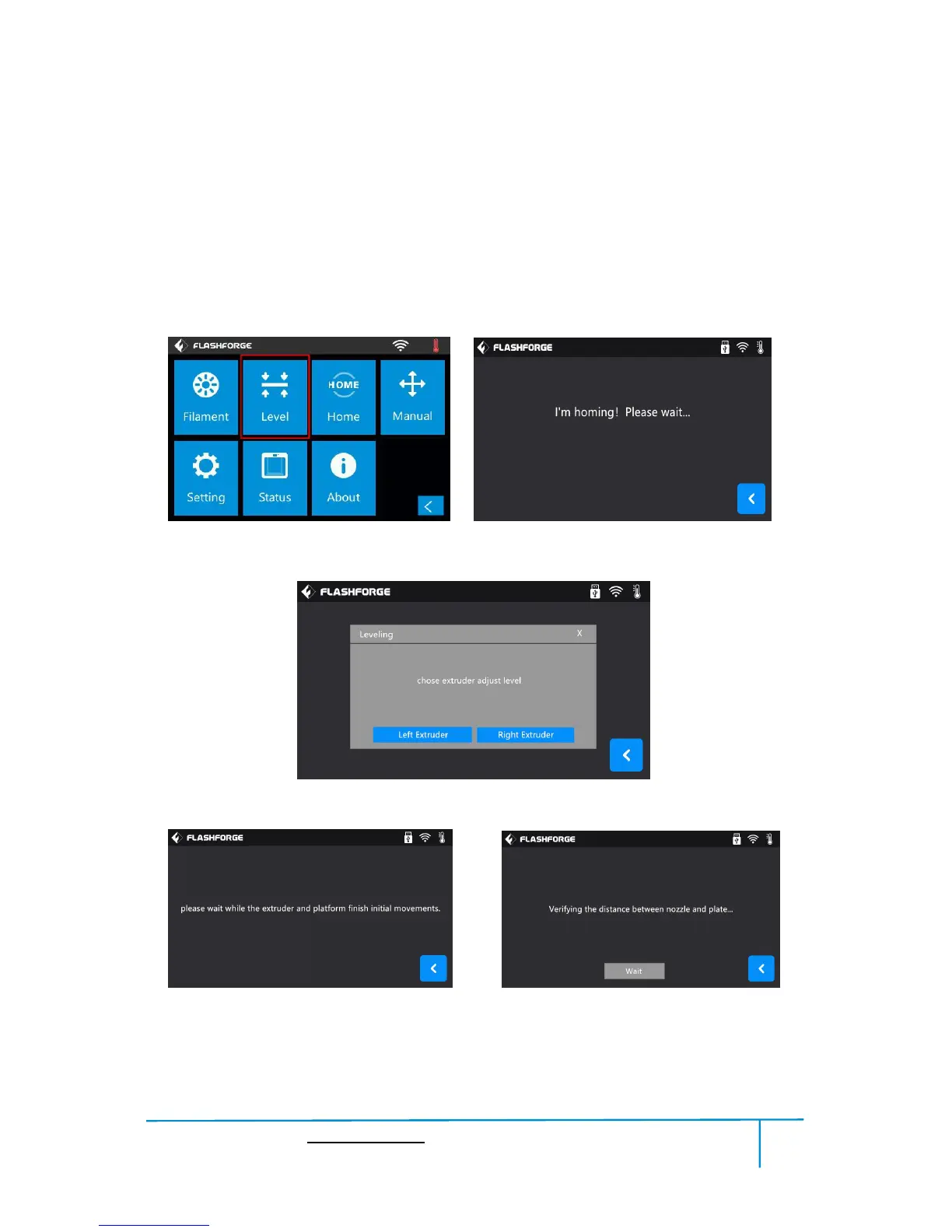 (5-1) Tap [Level] to start leveling. Wait while the extruder and platform finish homing