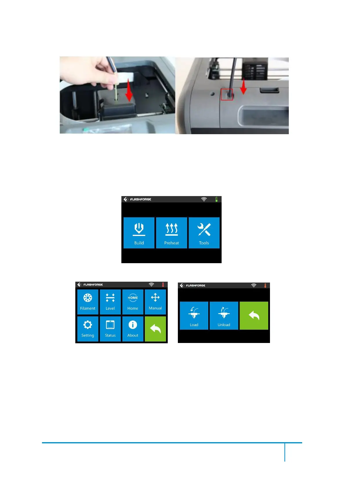 Next, we will load the Flashforge filament.(Note: Please lower the build plate to