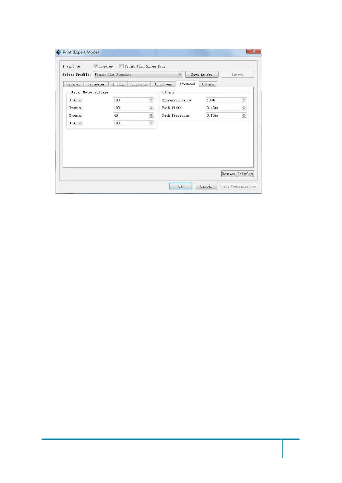 a.Extrusion Ratio: The filament amount extruded by the extruder. Default: 109%