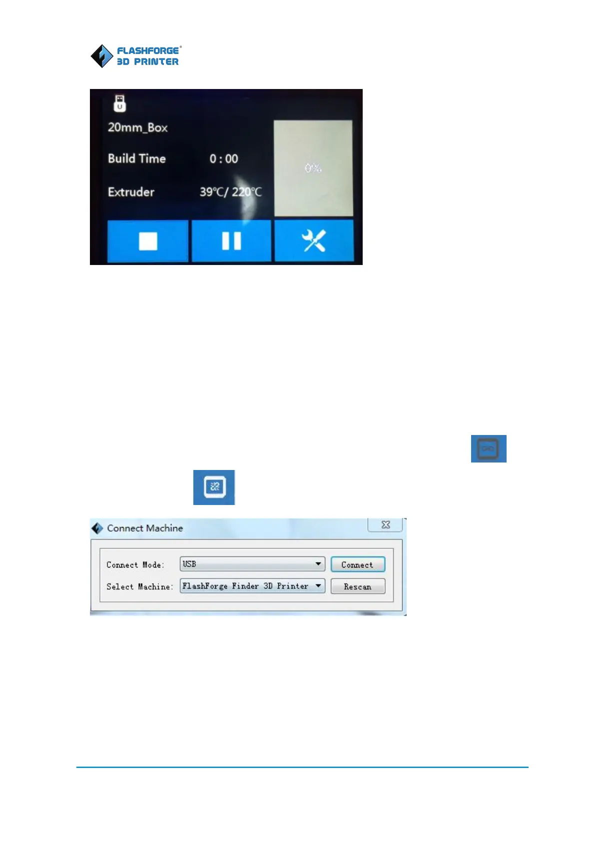 “FlashForge Finder” in [Select Machine] option. Finally click [Connect] button to connect to the