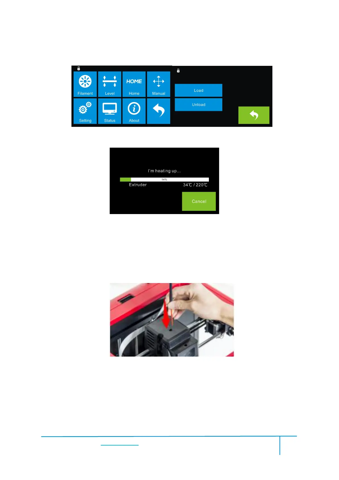 be drawn through the extruder. Do not tap [Cancel] until the filament exits the