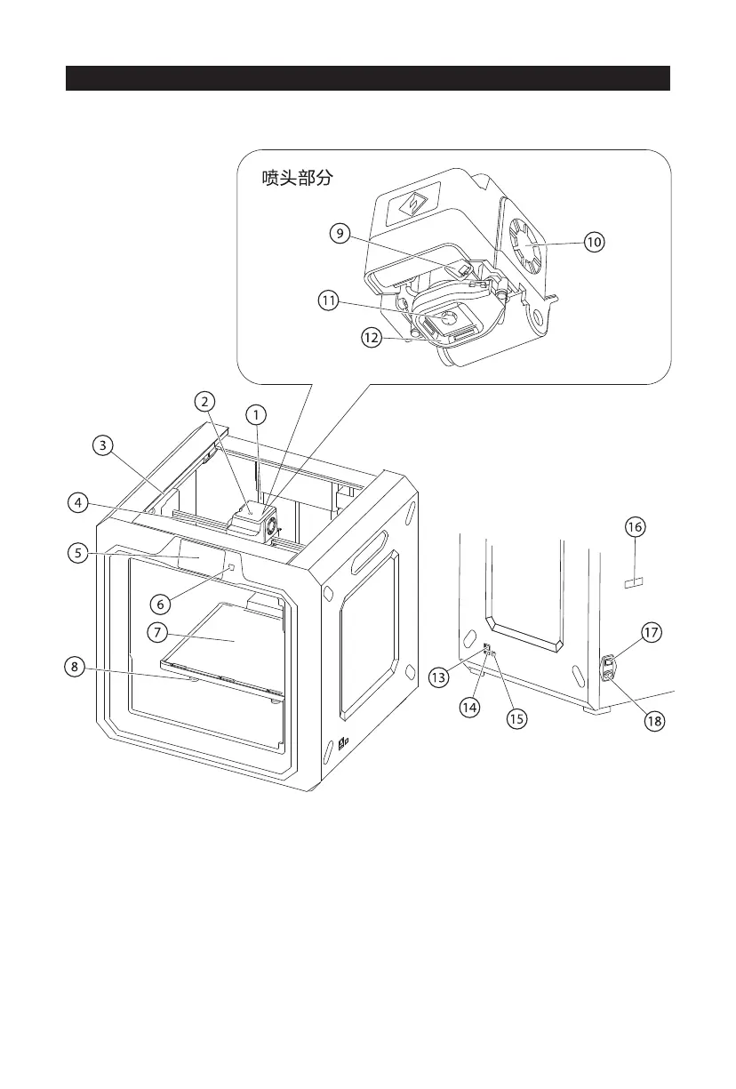6. 开关 7. 打印平台 8. 调平螺母 9. 调平舵机 10. 涡轮风扇