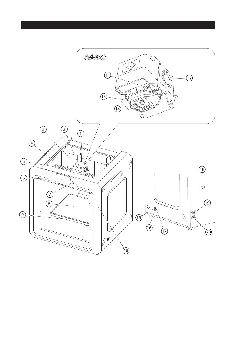 16. U盘接口 17. USB线接口 18. 丝盘轴插口 19. 电源开关 20. 电源线接口