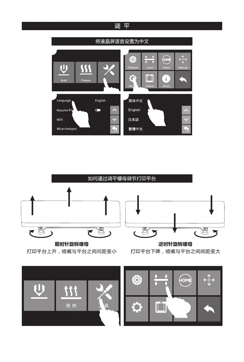 2. 语言设置完成后,点击返回键返回主界面,准备开始调平。在开始调平之前,让我们先了解一