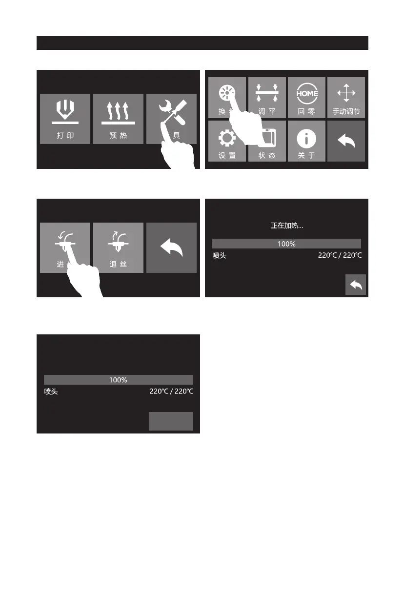 直到耗材均匀出丝为止。点击触摸屏右侧的开关返回主界面。