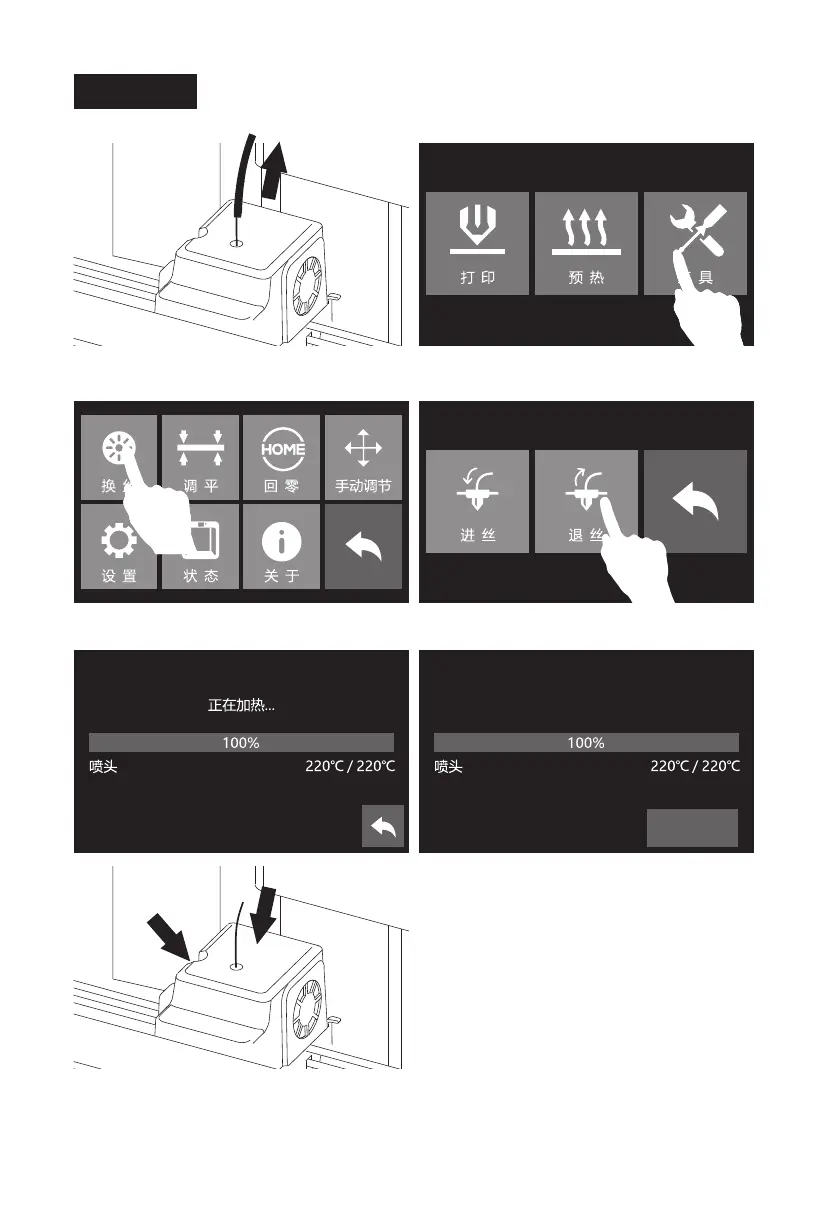 5. 喷头加热到预定温度后开始退丝,按下喷头