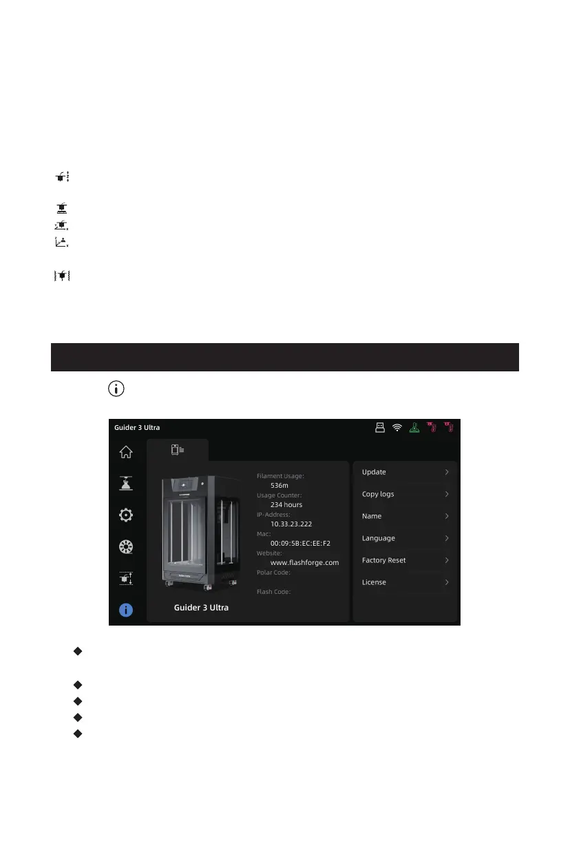 Extruder calibration and platform leveling can be carried out here. Top icons
